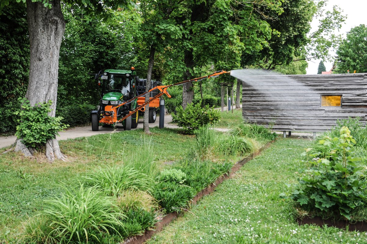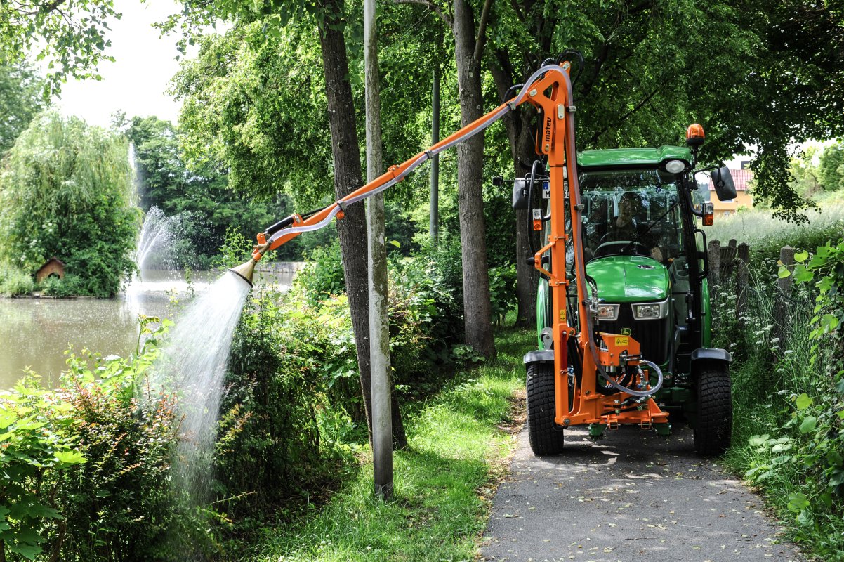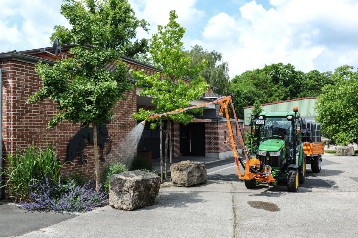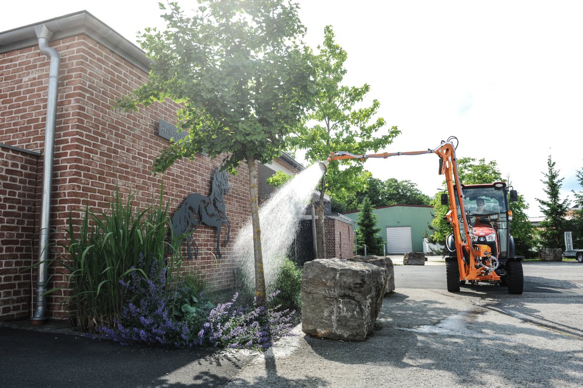 Hydraulisch ansteuerbare Bewegungen sorgen für punktgenaue Bewässerung – effizient und wassersparend.