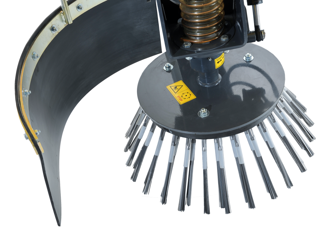 Der optionale Spritzschutz, der individuell auf die jeweilige Bürsteneinstellung angepasst werden kann, sorgt für ein sauberes und sicheres Arbeiten. Er verhindert effektiv, dass Schmutz, Steine oder Pflanzenreste während des Einsatzes der Wildkrautbürste unkontrolliert weggeschleudert werden.